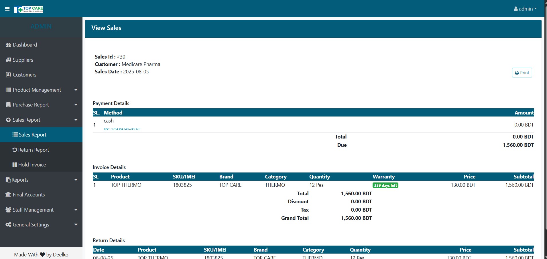- โฉ๏ธ Product Return: Handle sale return transactions with stock adjustments.
