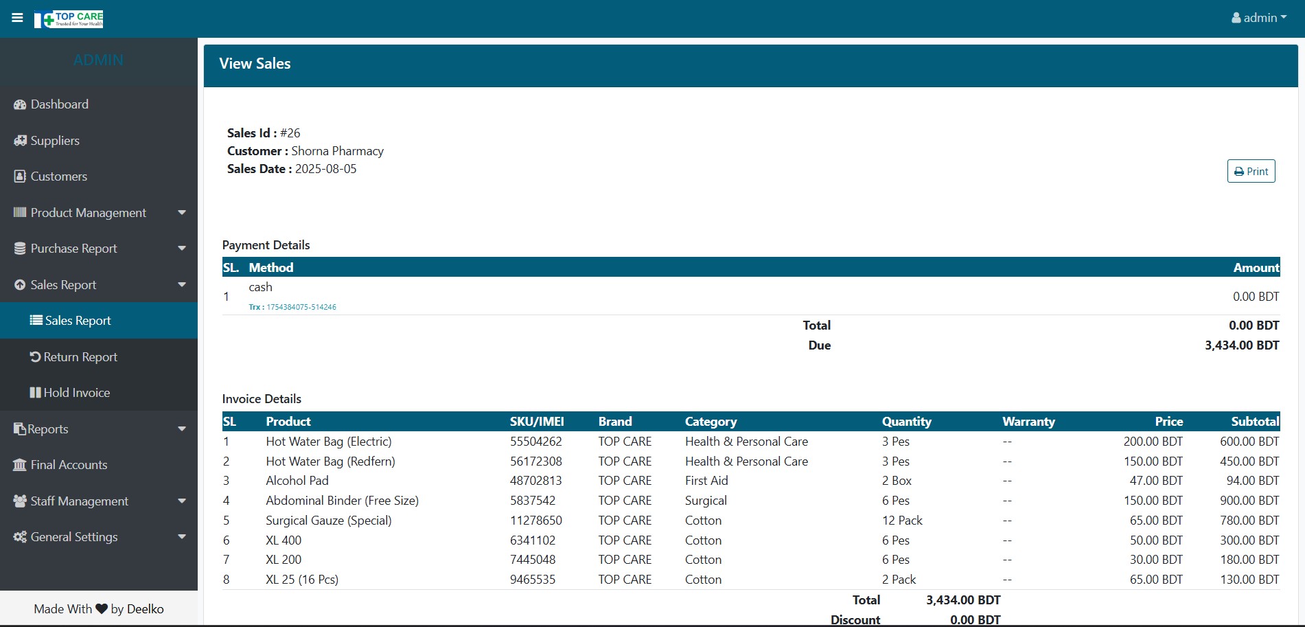 - ๐งพ Invoice Generation: Printable invoices with discounts, VAT, and totals.